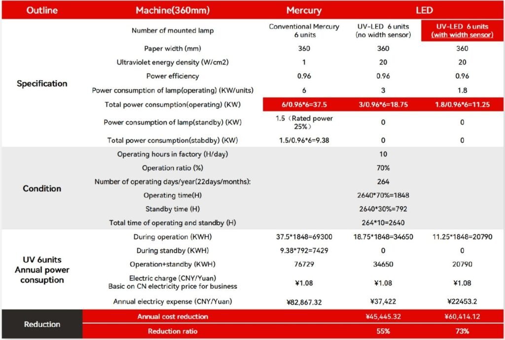 For instance, with a 360mm printing width, six-color printing setup, and an average operational schedule of 10 hours per day over 22 days each month, the energy consumption varies notably between traditional mercury lamps and LED UV systems.